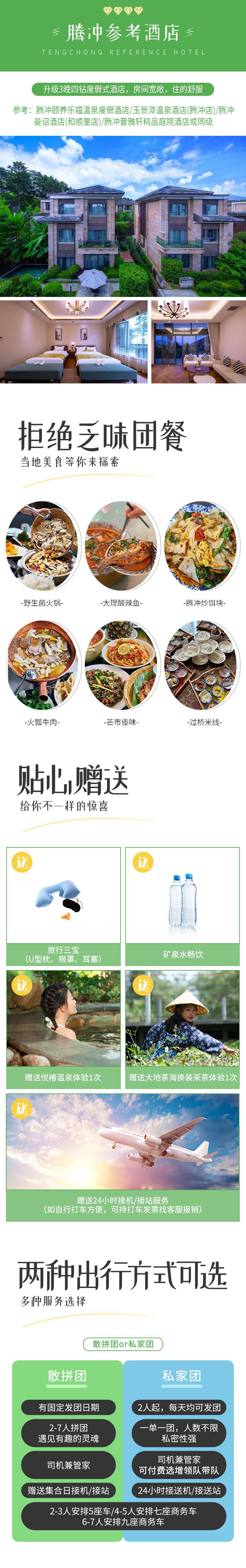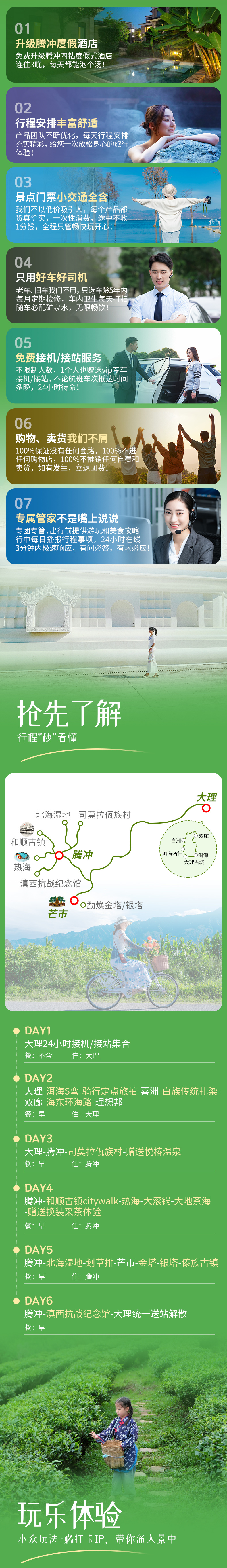 1)升级腾冲度假酒店:四钻度假式酒店连住3晚,每天都能泡个汤 2)每天行程安排充实精彩,给您一次放松身心的旅行体验 3)景点门票小交通全含,途中不收1分钱,全程只管畅快玩开心 4)只选车龄5年内新车,定期检修,每天打扫,随车配矿泉水,无限畅饮 5)保证不进任何购物店,不推销任何自费和卖货,如有发生,立退团费 6)专属管家24小时在线3分钟内极速响应,有问必答,有求必应 7)免费接送机/站